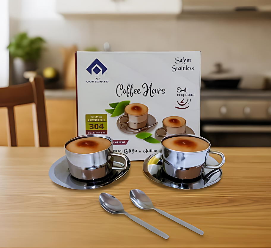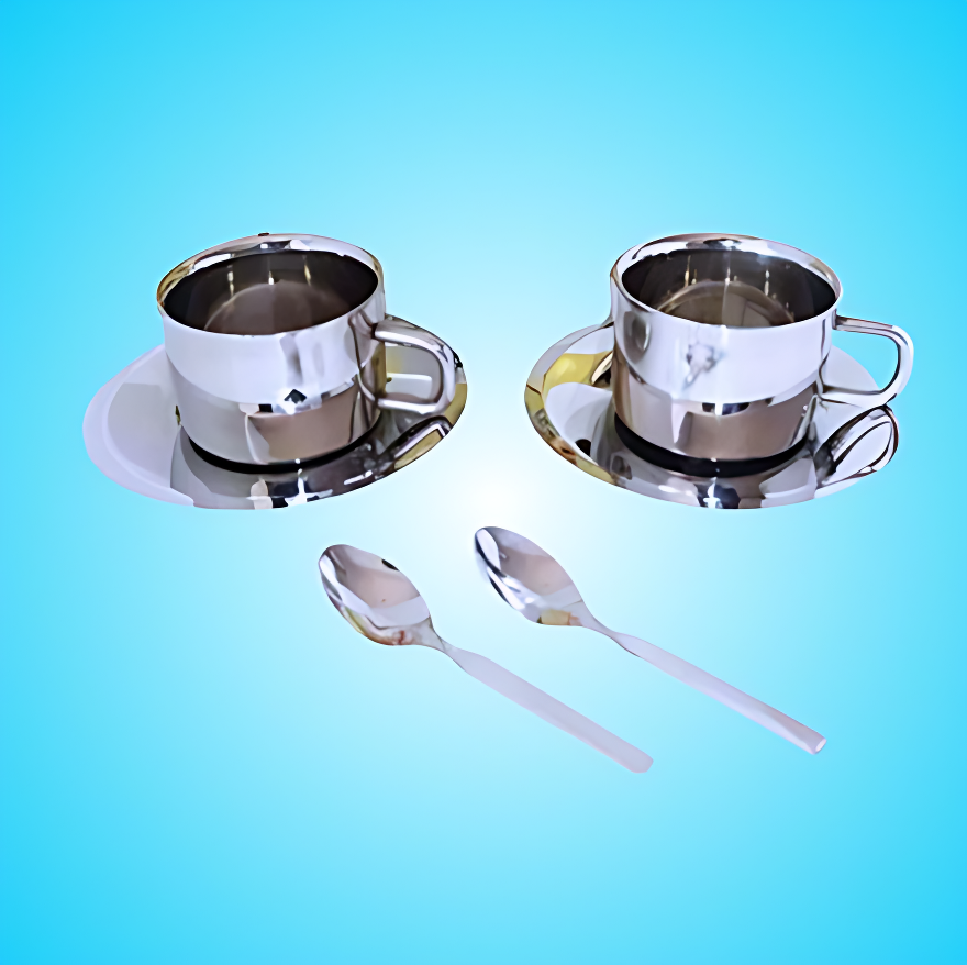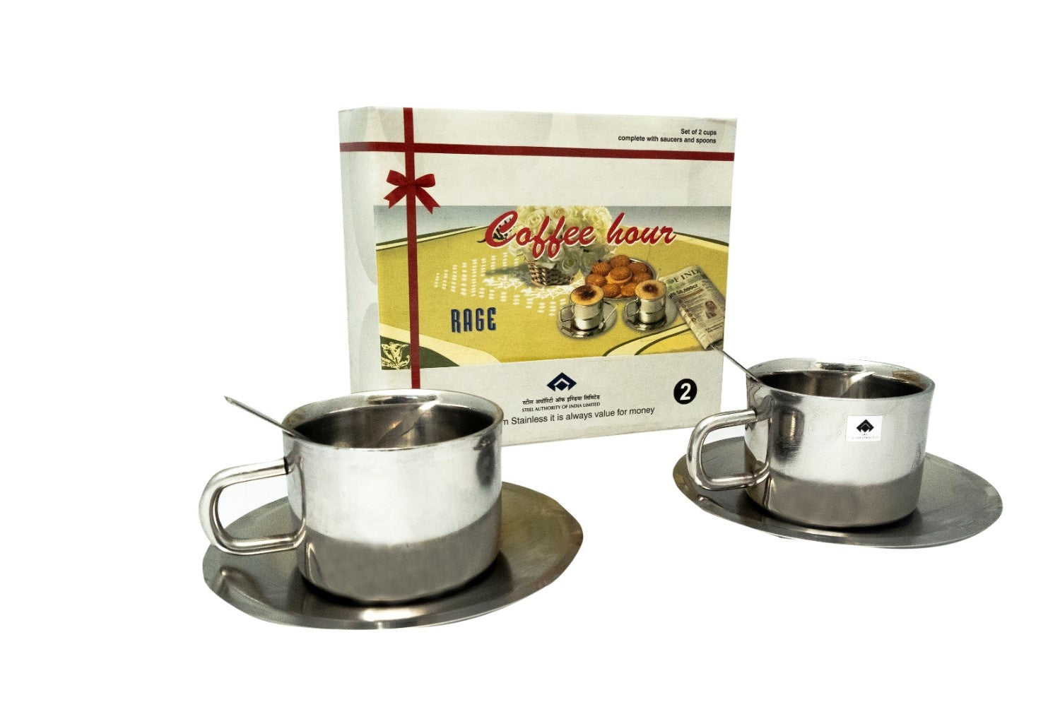- Cup And Saucer Set Of 2, beautifully designed, is made from 304 grade stainless steel and is thus meant to last for generations and generations. Premium quality mirror finish stainless steel cups are double-walled, cool to the touch.