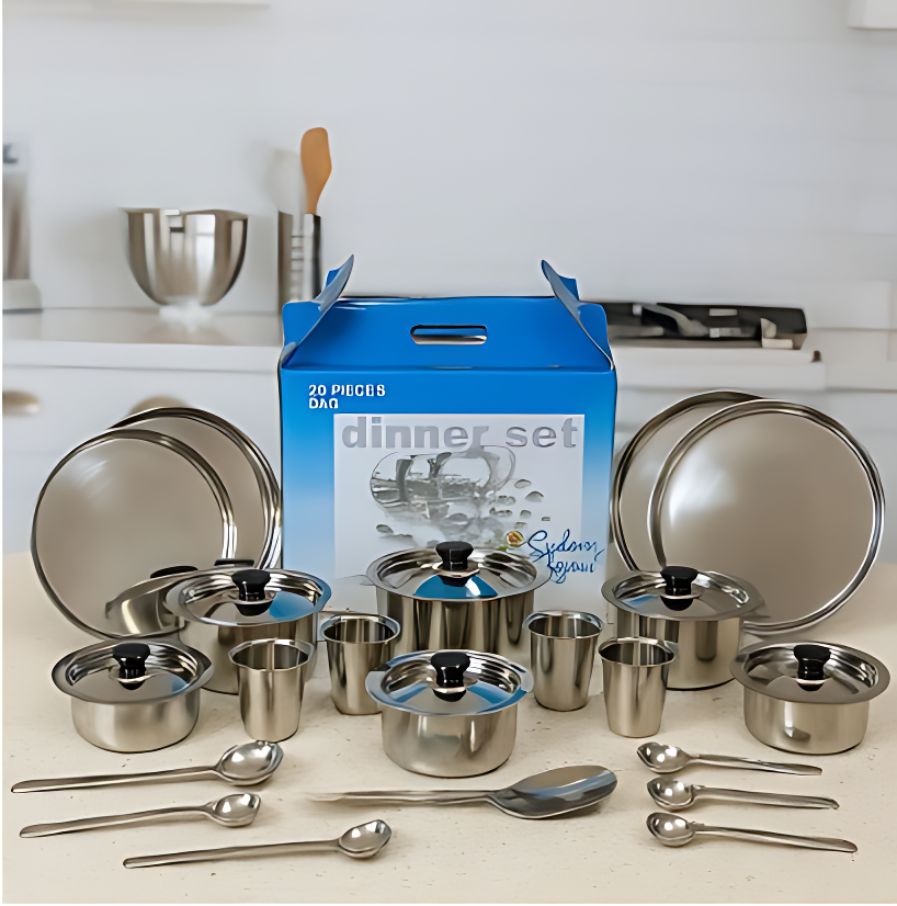 • It comes in a beautifully printed paper box and is an ideal dinner set for a family of 4. It is dishwasher safe, stain-free, durable, and freezer safe. SAIL SALEM 20 Pc Dinner Set- (Top Model) is made from guaranteed 304 grade stainless steel and is thus meant to last for generations and generations.