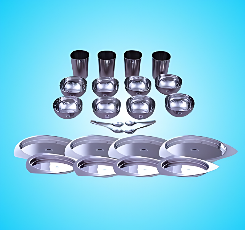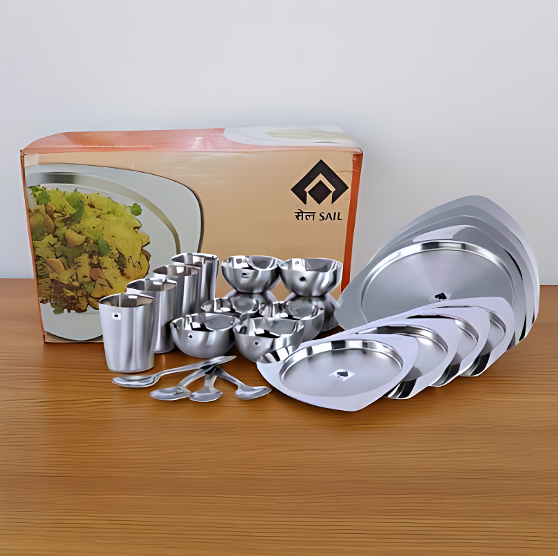 - It comes in a beautifully printed paper box and is an ideal dining set for a medium-sized family. The Symphony Dinner Set has a matte finish. It indeed gives you a unique experience to relish your food. It is dishwasher safe and stain-resistant. SAIL SALEM 24 Pc Symphony Dinner set is made from guaranteed 304-grade stainless steel and is thus meant to last for generations and generations.