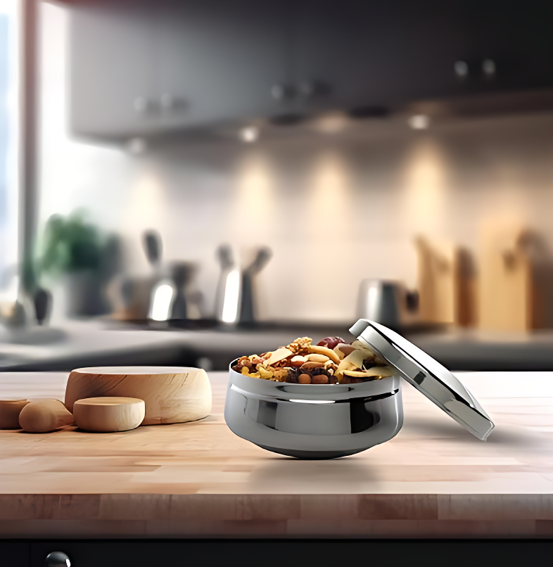 - Nuts Container With Lid, beautifully designed and made from 304-grade stainless steel. A healthy food-grade storage container for storing nuts, namkin, and leftovers in the fridge.